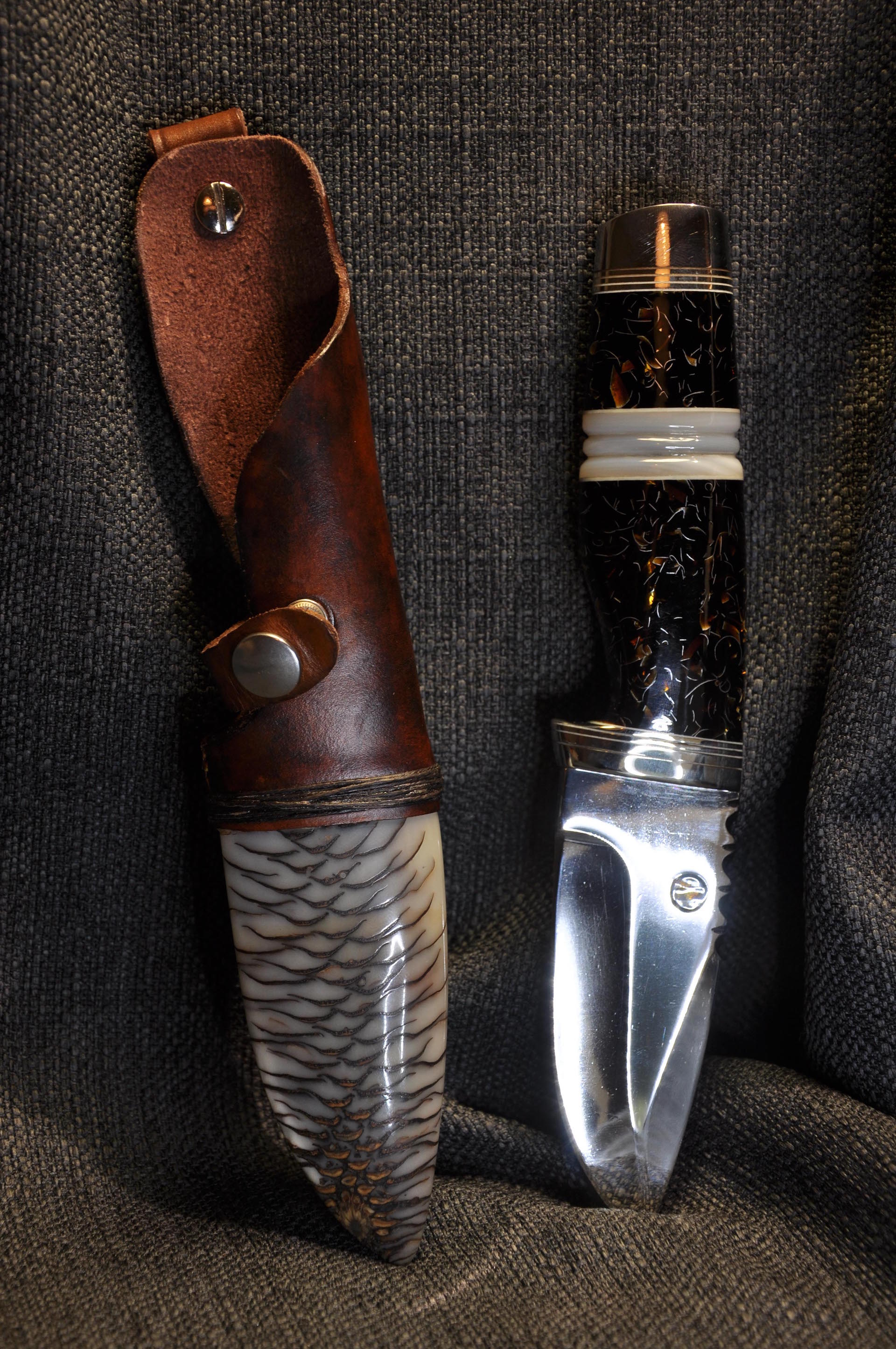 Blad: Rostfritt tillstukat av mig med fileworks och infälld bärnsten med en bladlängd på knappt 100 mm.