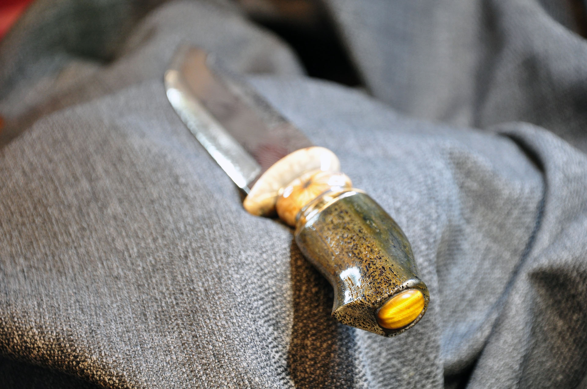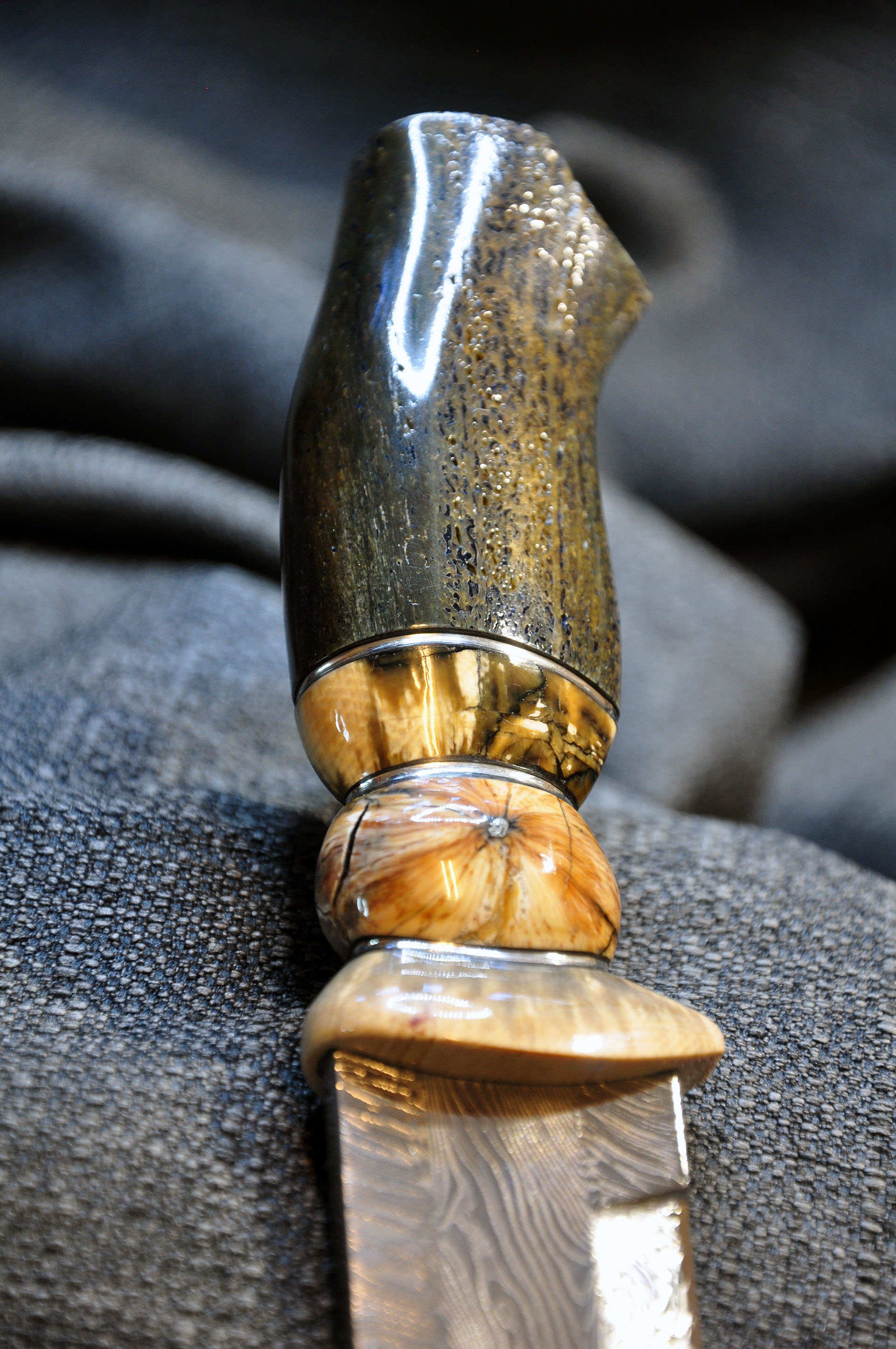 Skaft: Fossilt ben från sjöko samt bete och tand från mammut. Inlägg av tenn och svart vulkanfiber. Infällt längst bak ett tigeröga.