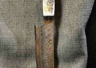 Handle of stabilized antique reindeer antler, corian and white mother of pearl